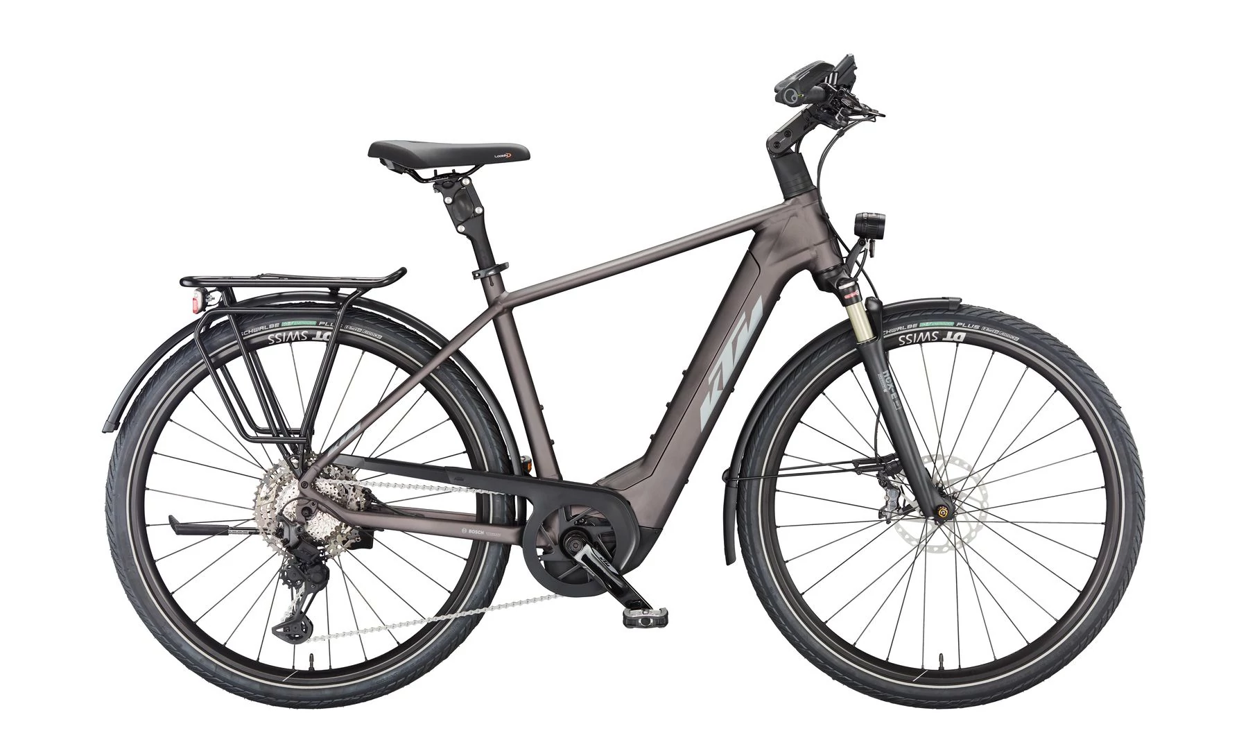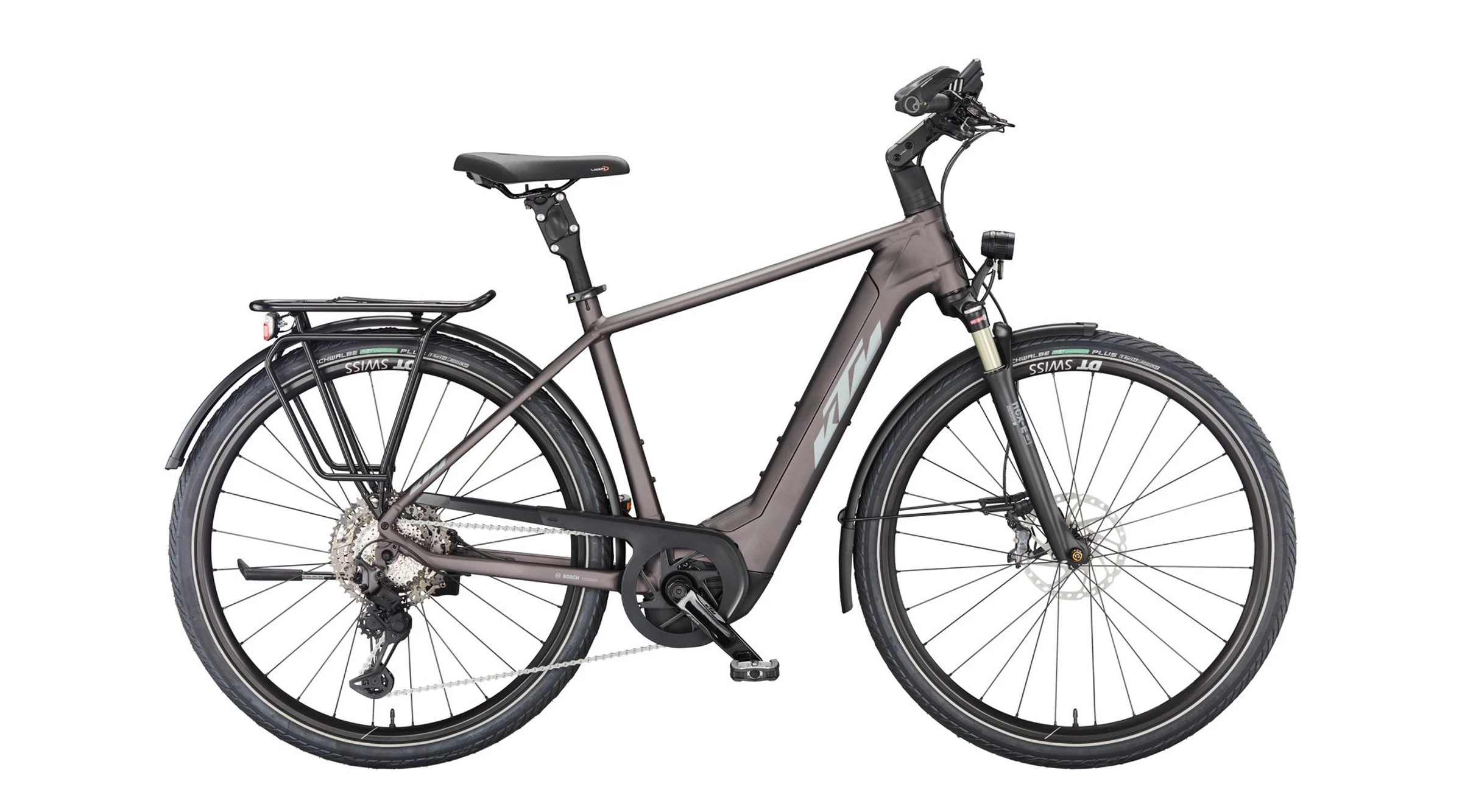 Gumiból a német Schwalbe Energizer Plus Perf. GreenGuard köpeny került a kerékpárra 50mm-es szélességben. Szélessége okán kényelmes, a mintázata pedig tökéletes aszfaltos túrákhoz. Ez is szintén egy az eBikeok igénybevételéhez fejlesztett darab.