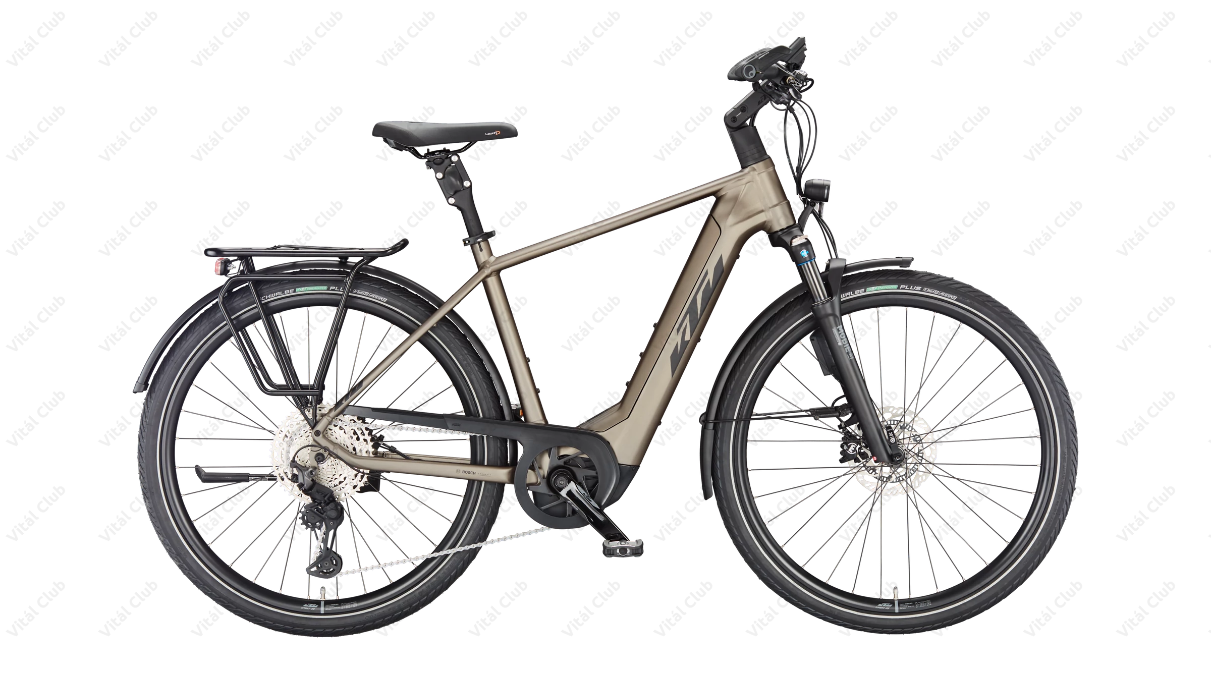 Gumiból a német Schwalbe Energizer Plus Perf. GreenGuard köpeny került a kerékpárra 50mm-es szélességben. Szélessége okán kényelmes, a mintázata pedig tökéletes aszfaltos túrákhoz. Ez is szintén egy az eBikeok igénybevételéhez fejlesztett darab.