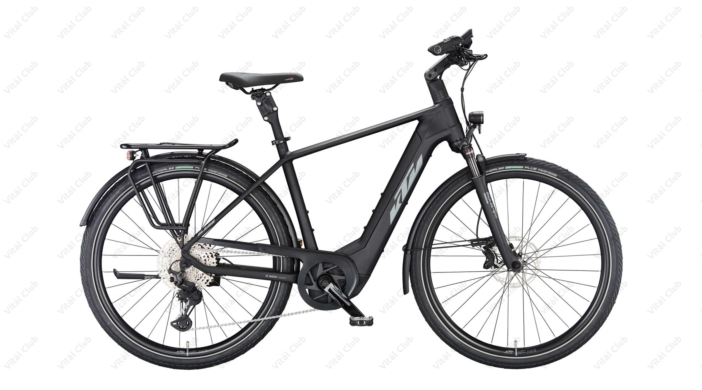 Gumiból a német Schwalbe Energizer Plus Perf. GreenGuard köpeny került a kerékpárra 50mm-es szélességben. Szélessége okán kényelmes, a mintázata pedig tökéletes aszfaltos túrákhoz. Ez is szintén egy az eBikeok igénybevételéhez fejlesztett darab.