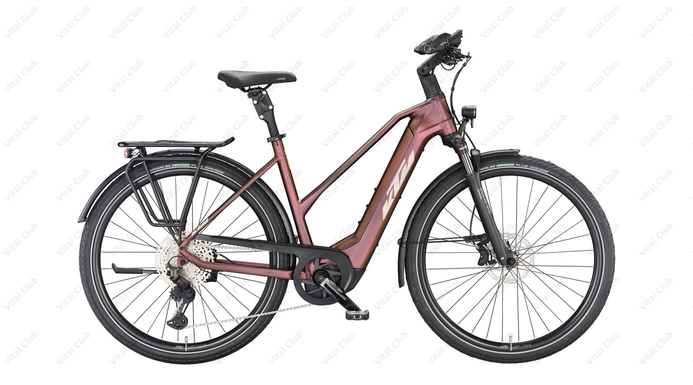 Gumiból a német Schwalbe Energizer Plus Perf. GreenGuard köpeny került a kerékpárra 50mm-es szélességben. Szélessége okán kényelmes, a mintázata pedig tökéletes aszfaltos túrákhoz. Ez is szintén egy az eBikeok igénybevételéhez fejlesztett darab.