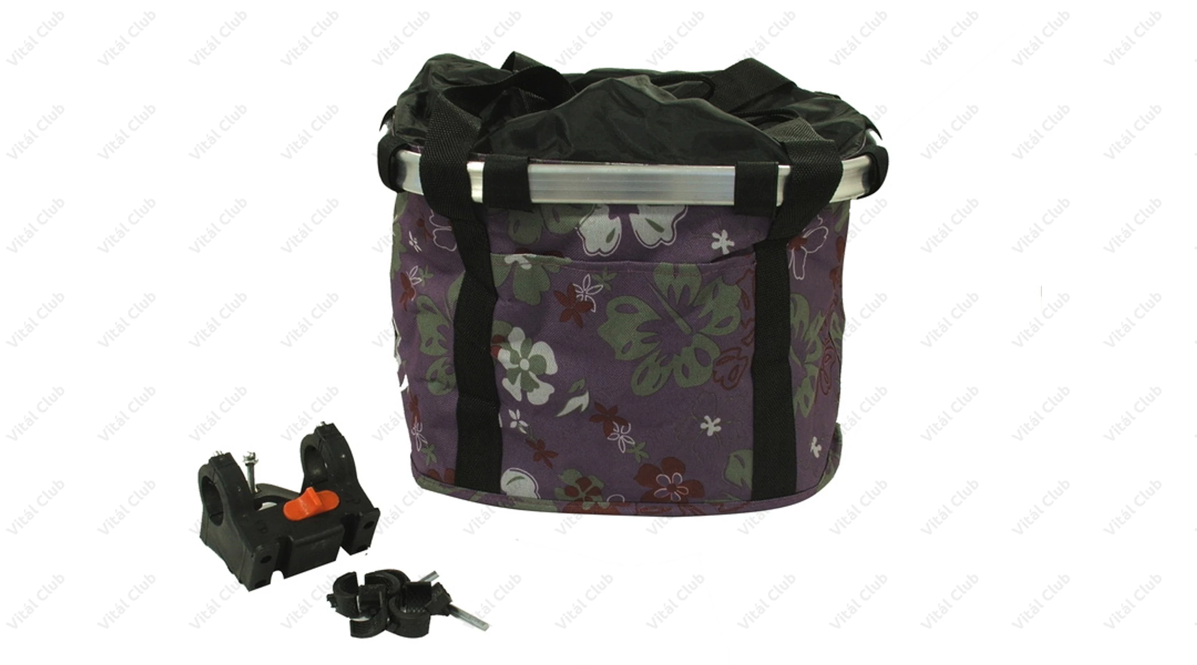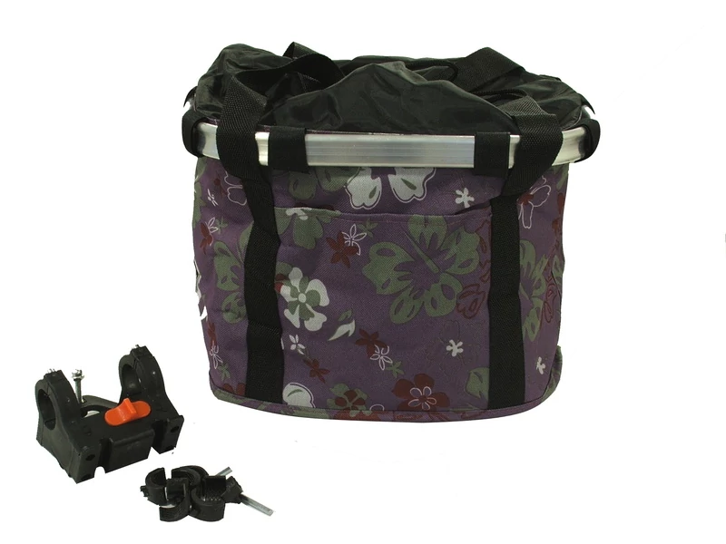 Kerékpáros első kosár, alukerettel, merev fenékrésszel, 5 kg-os terhelhetőség, sötét lila színű, virág mintával