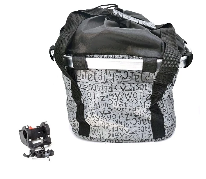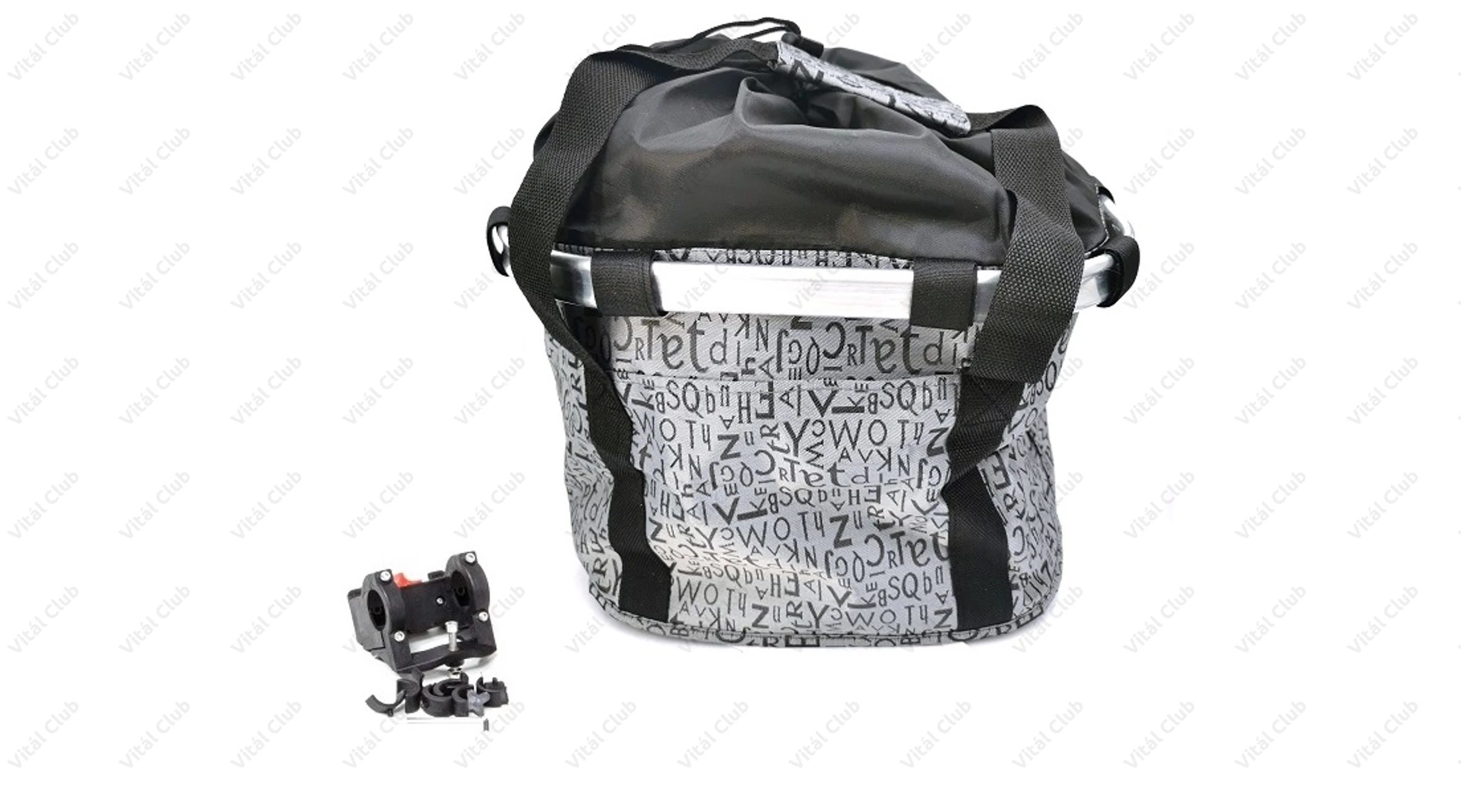 Kerékpáros első kosár, alukerettel, merev fenékrésszel, 5 kg-os terhelhetőség, szürke színű, betűmintás