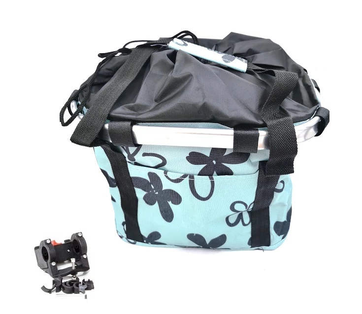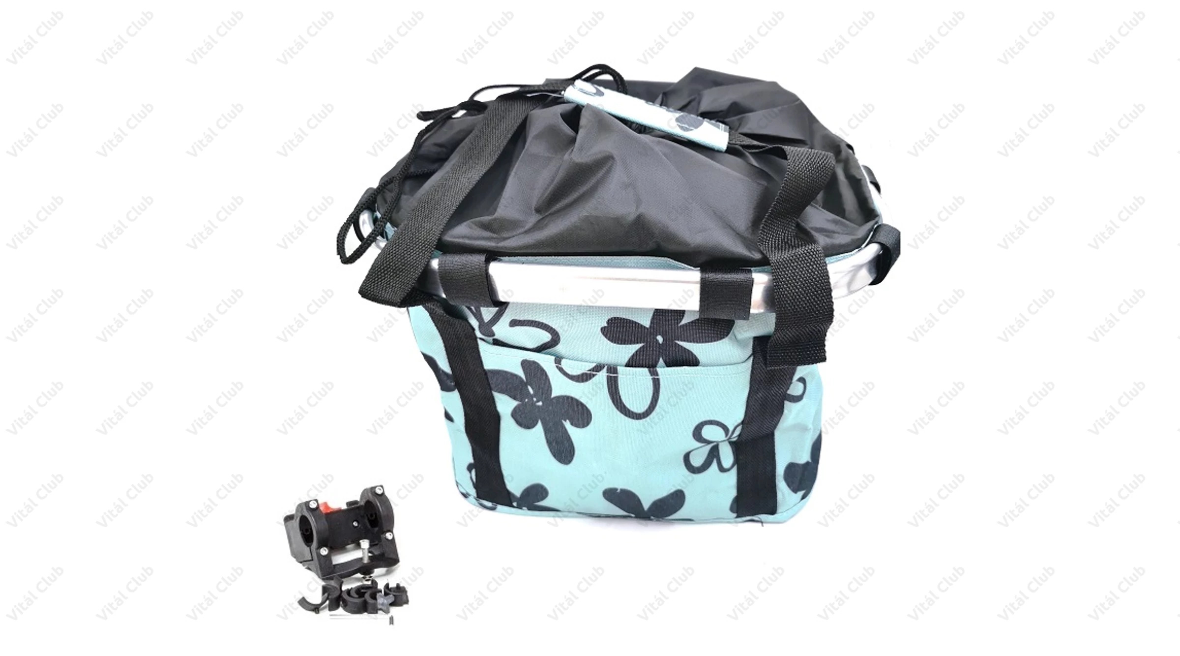 Kerékpáros első kosár, alukerettel, merev fenékrésszel, 5 kg-os terhelhetőség, világos kék színű, virág mintás